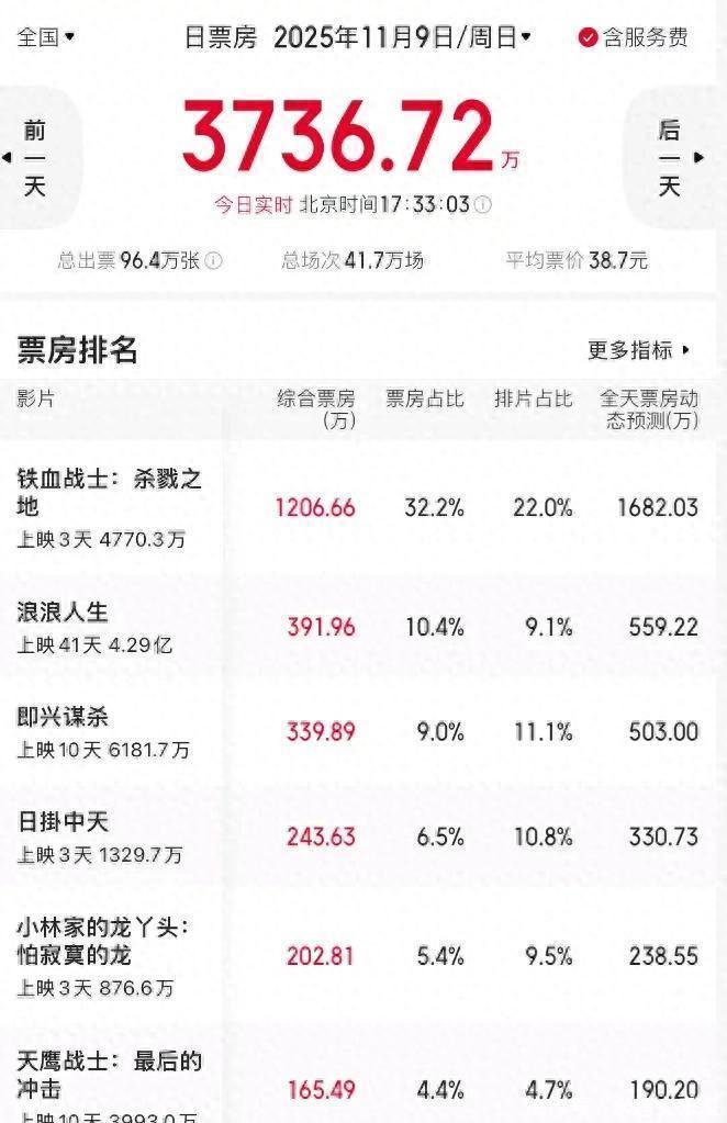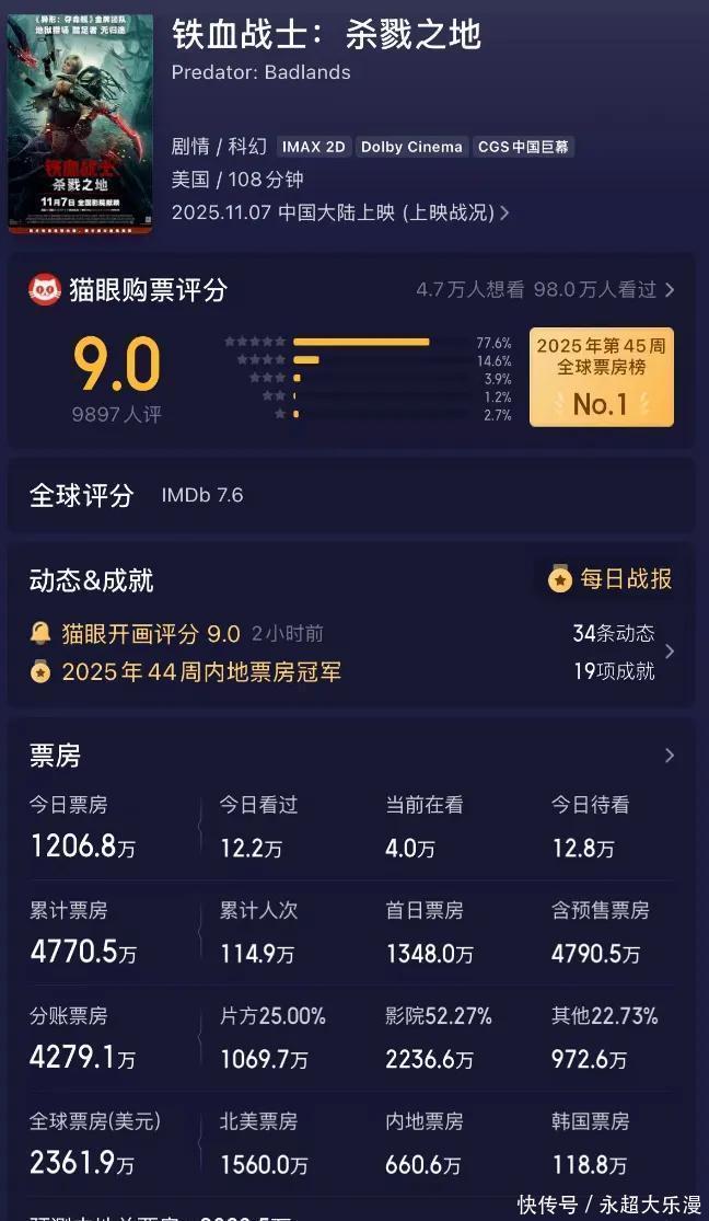 3天轰下5000万,好莱坞猛片杀疯了!《日掛中天》无还手之力 周五新片扎堆上,没想到周六单日票房直接冲到 6500 万以上,这可是好久没见的热闹场面!要知道之前好些时候单日票房连千万都摸不到,这次居然有部电影单天就卖了 2000 多万,就是《铁血战士:杀戮之地》这部片子呀。 它首日票房 1348 万,第二天直接涨到 2172 万,今天也破了 1200 万,三天下来居然狂揽 5000 万票房,简直是杀疯了的节奏!这段时间里,论票房表现它真的算是顶流了。不光国内卖得火,北美和全球市场也超给力,三天全球票房就有 2361 万美元,实力太能打了。